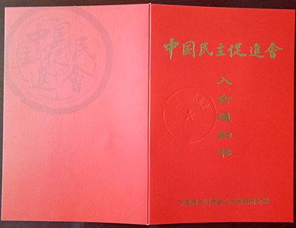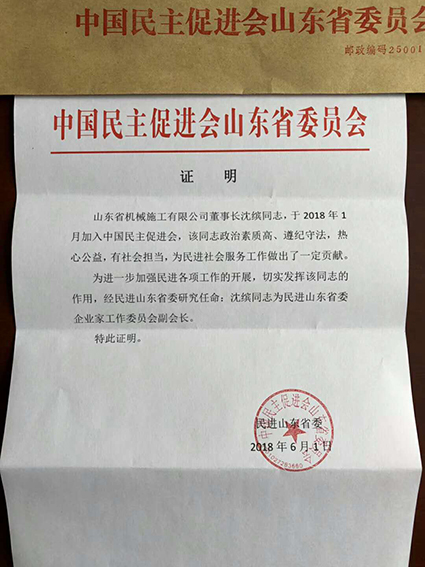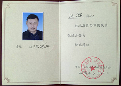 公司董事長(zhǎng)沈繽同志于20181申請(qǐng)加入中國(guó)民主促進(jìn)會(huì)3月份中國(guó)民主促進(jìn)會(huì)山東省委員會(huì)正式批準(zhǔn)沈繽同志加入中國(guó)民主促進(jìn)會(huì)。